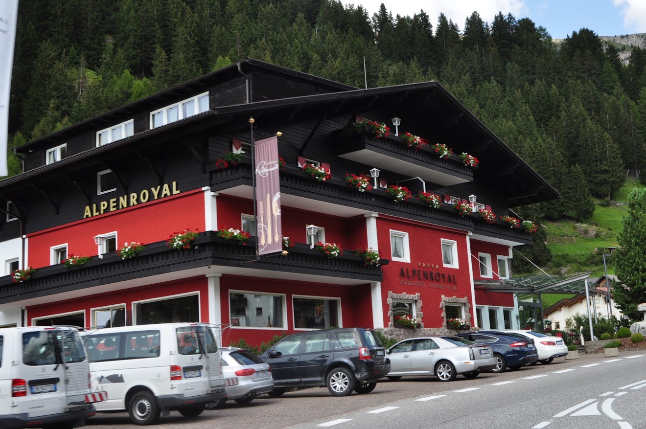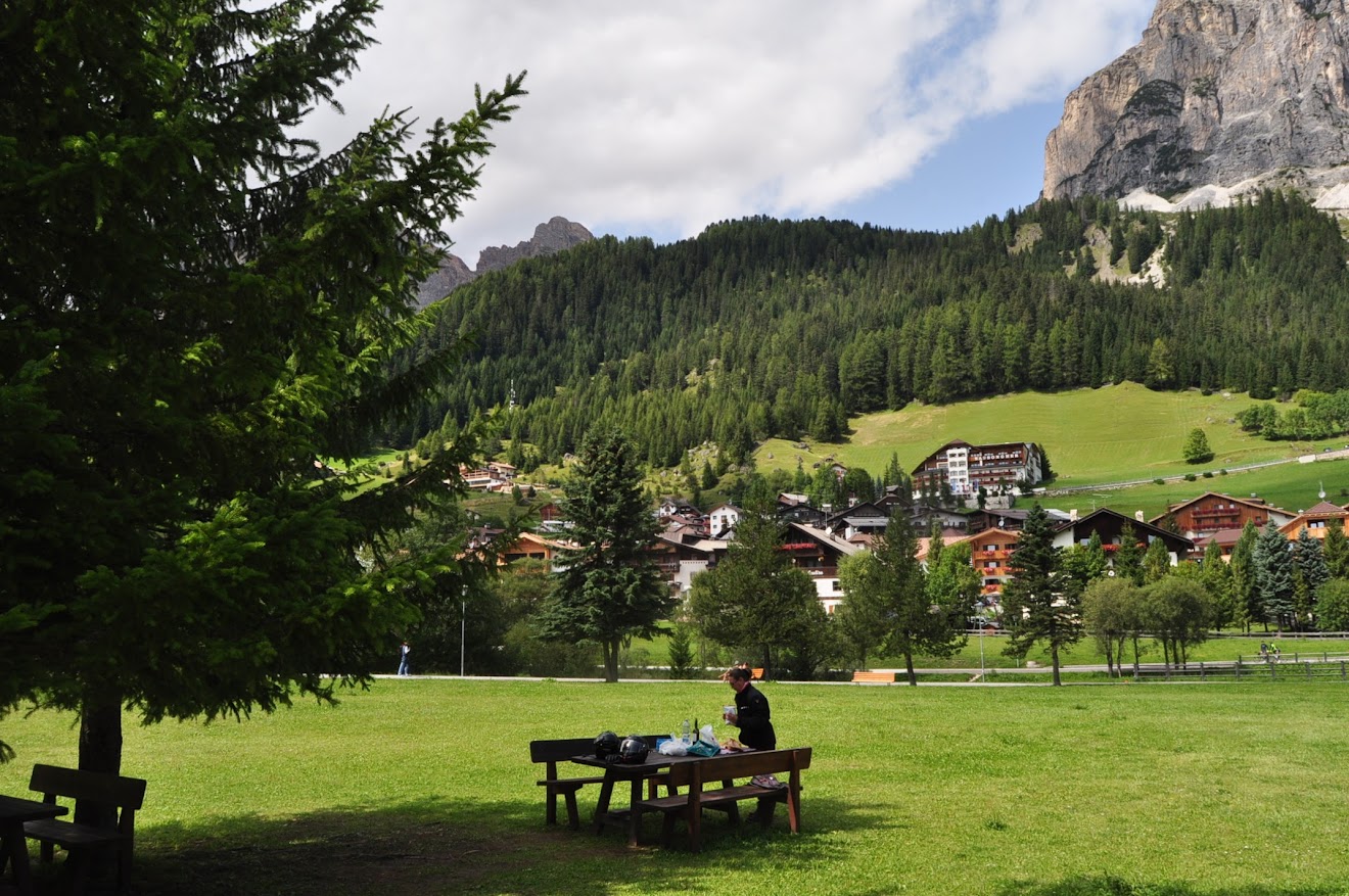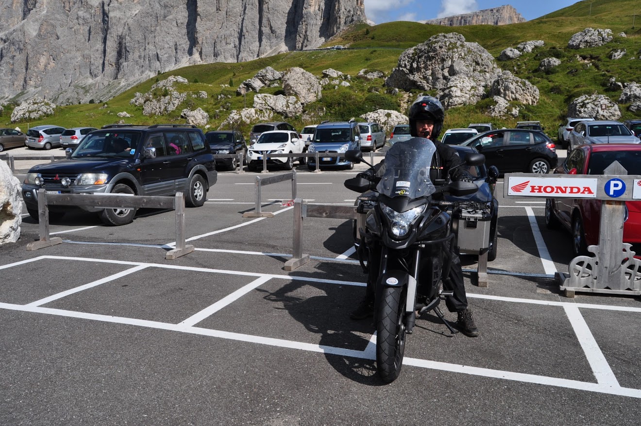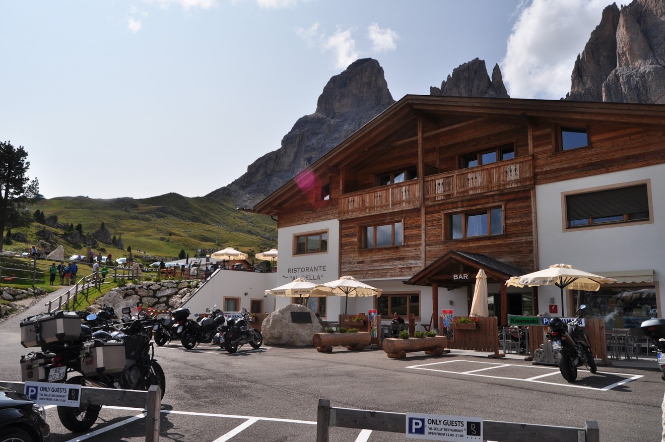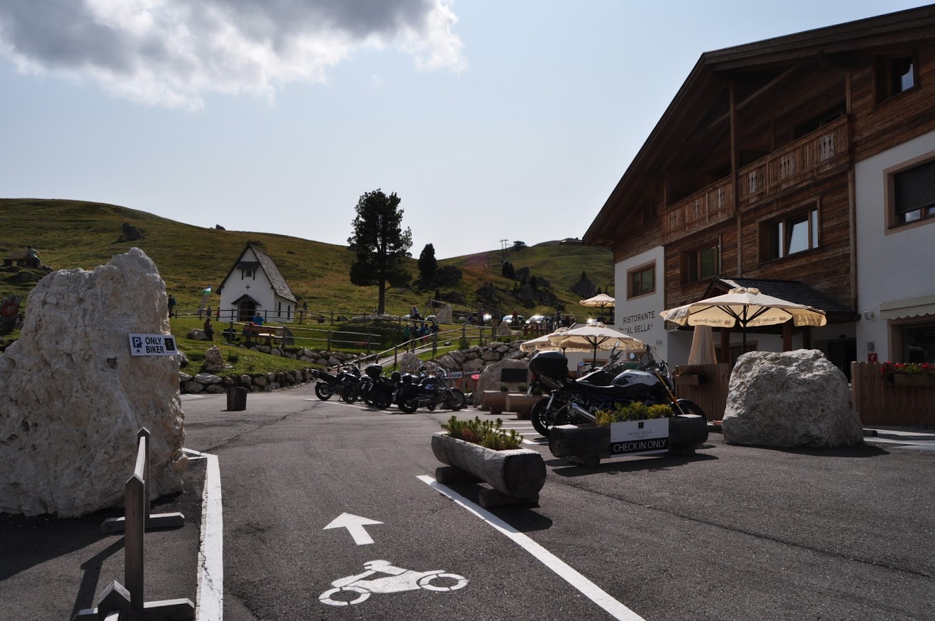 Paragem para café no Passo Sella (2.180m), numa esplanada dum resort onde só estacionam motos. Já de si é curioso, ainda mais quando tem as marcas das motos nos espaços de estacionamento. Que luxo! 😎